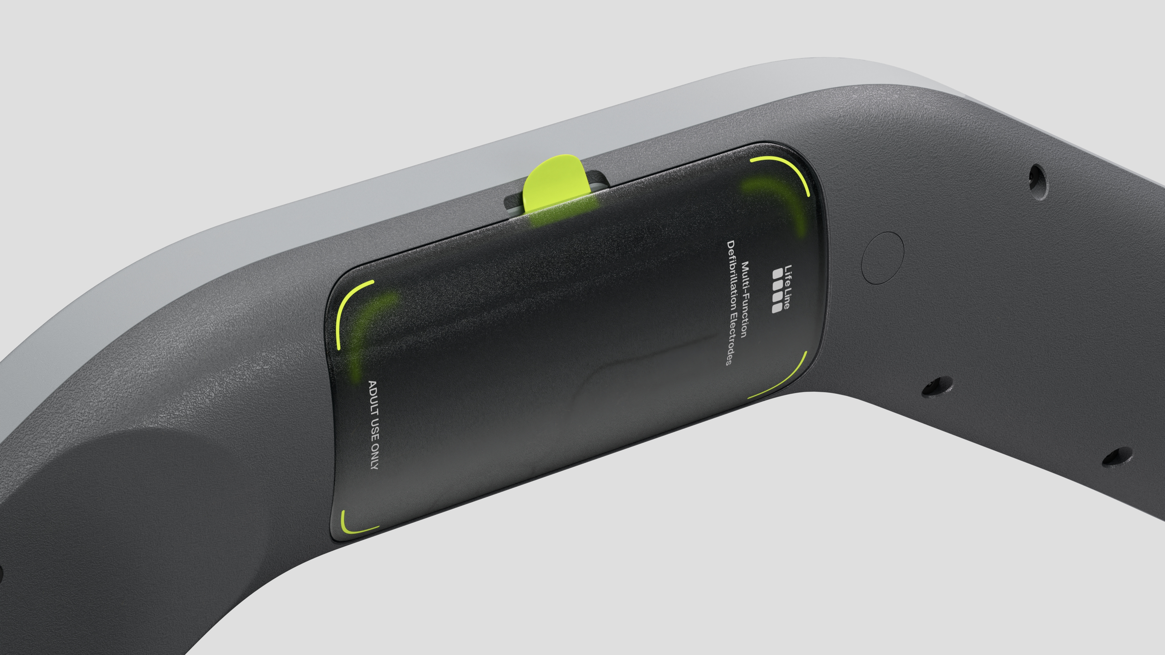 The electrode pads are folded and stored in custom-designed canisters integrated into the arms and back of the device. This makes them ready for deployment in seconds—and replacing used pads is equally effortless.